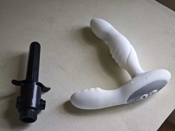 左边这个赠送的后庭清洗器,右边是按摩器本体。这个清洗器非常重要,如果不是商家赠送,可能我的第一次后庭插入会搞得满床是粑。并且,我认为清洗后庭的过程要比使用按摩器舒服很多。